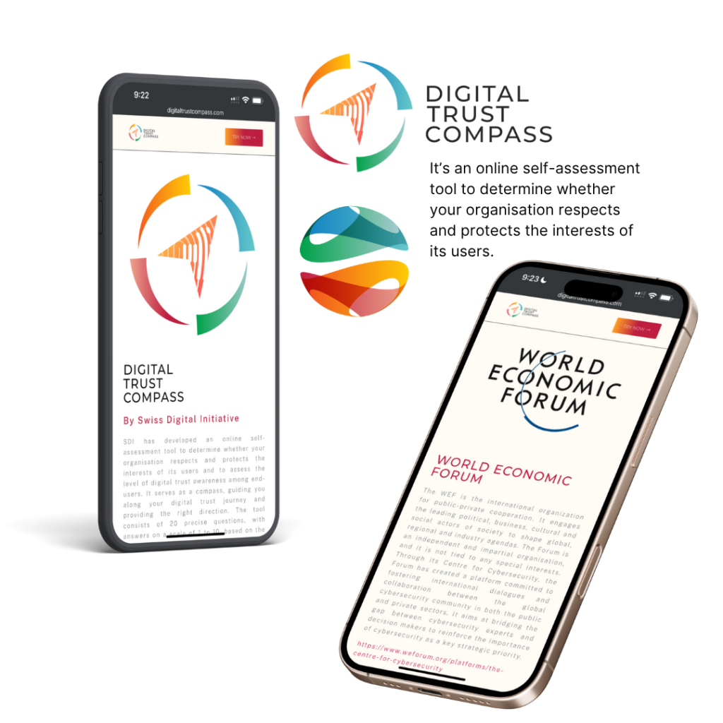 Simultaneously, Adrian worked alongside the Swiss Digital Initiative to launch the “Digital Trust Movement” — a comprehensive brand identity and self-assessment ecosystem for organisations. This included developing the Digital Trust Compass: a publicly accessible online tool that helps companies evaluate their handling of privacy, security and data responsibility. All campaign elements — from visual identity to backend logic — were designed and implemented by Adrian and his team.