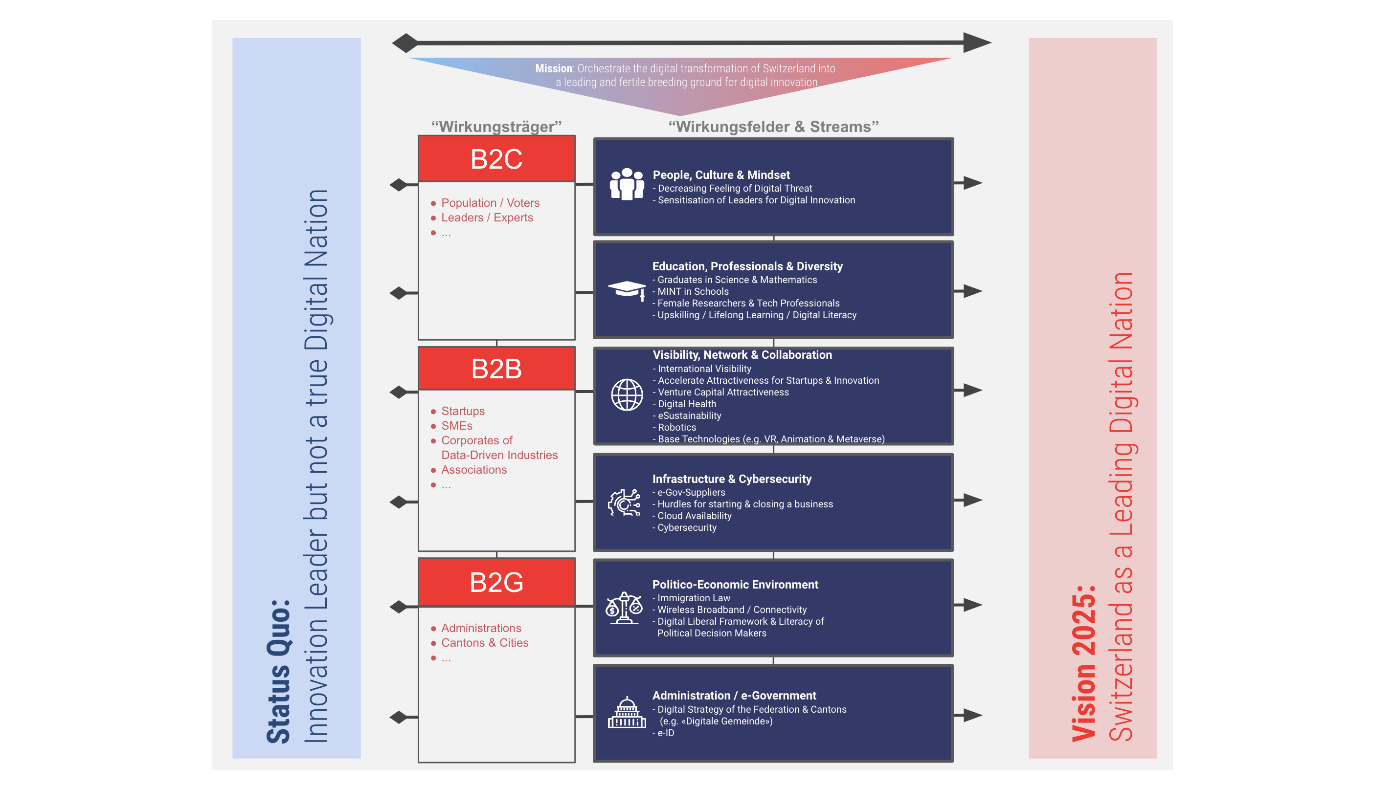 To achieve our vision to transform Switzerland into a leading digital nation, we act as an orchestrator together with our members, partners, and other important stakeholders – the agents of impact (“Wirkungsträger”) – in the area of B2C, B2B and B2G.