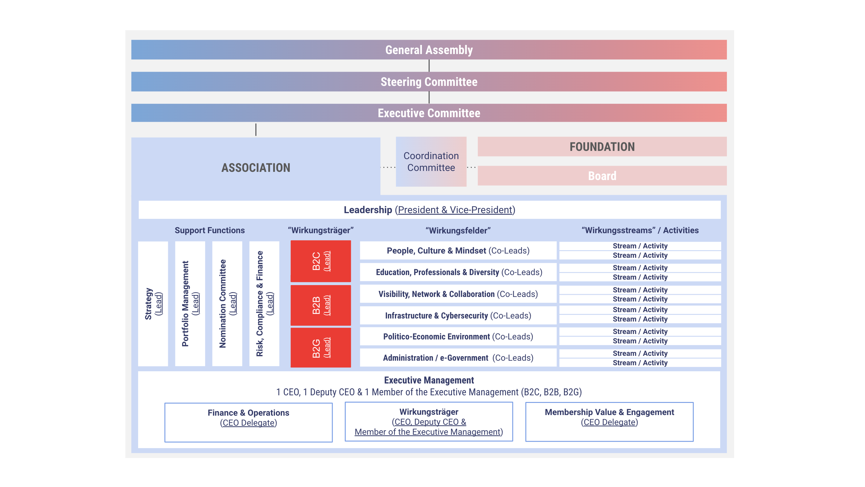 All our association members come together and form our “General Assembly”. The Steering Committee is the strategic advisory board to the Executive Committee. The Executive Committee – our association board – is elected by the General Assembly. It is organised along our “impact logic” (“Wirkungslogik”) with accountable leaders per “Wirkungsträger” and “Wirkungsstream” and complemented by specific support functions such as: “Strategy”, “Portfolio Management”, “Nomination Committee” as well as “Risk, Compliance & Finance”.