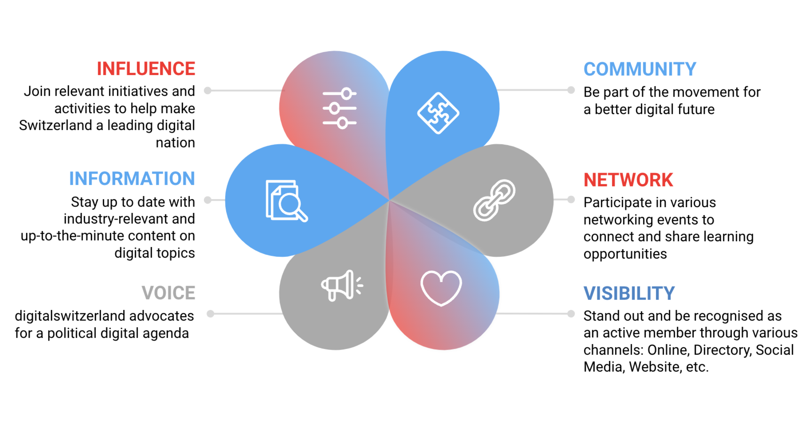 The main motivation of becoming a member of digitalswitzerland is the commitment to the long-term responsibility needed for Switzerland to become a leading digital nation to be fit for the future. However, a membership at digitalswitzerland offers many benefits and opportunities for involvement – see below: